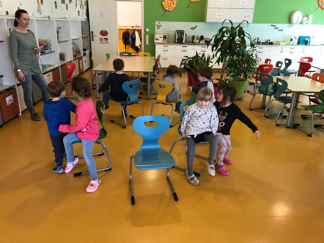 Mir hunn als eicht Spill "Eine Reise nach Jerusalem" gespillt, no e puer Ronnen hunn ma dunn "Muppi Muppi den Schank ass fort" gespillt an nodeems all Kand eng 4-5 mol den Mupp konnt sinn hunn ma nach "Ringli Ringli Rosen", "Hieschen an da Kailchen" & "Häschen in der Grube", "Zéiharmonika" an "Op da schéiner grénger Wiss" gespillt.