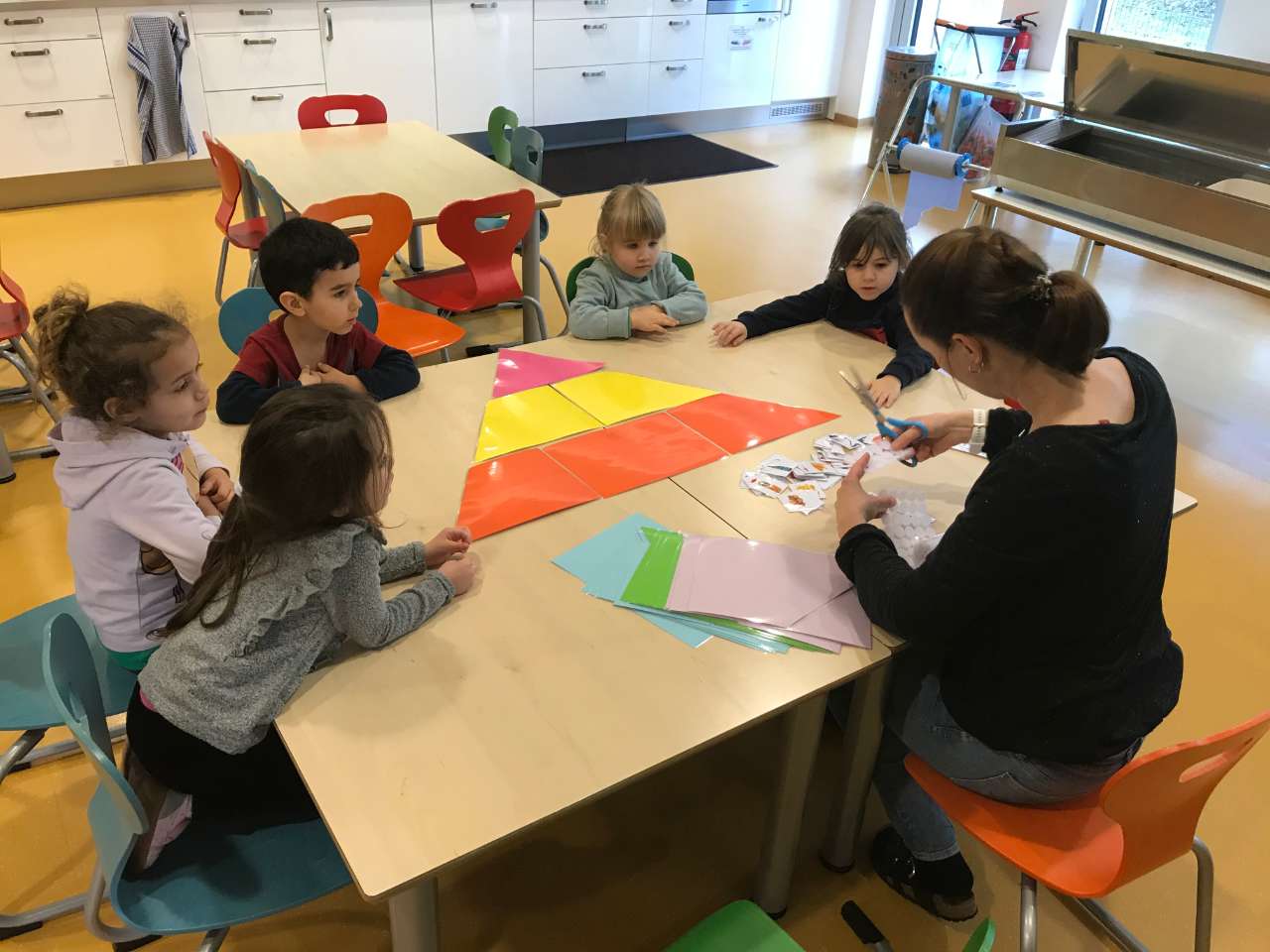 Dunn hunn ech Kanner all bei den Dësch geruff an se sech setzen gelooss. Dunn hunn ech hinnen gesot dat mir een Schléck géingen bastelen, als als eicht all Deeler rausschneiden, een Deel mat den Faarwen (Bläistëft oder Tusch) molen, dono alles zesummen pechen an dann dem Schléck säin Haus mat "Playmais" verschéineren.