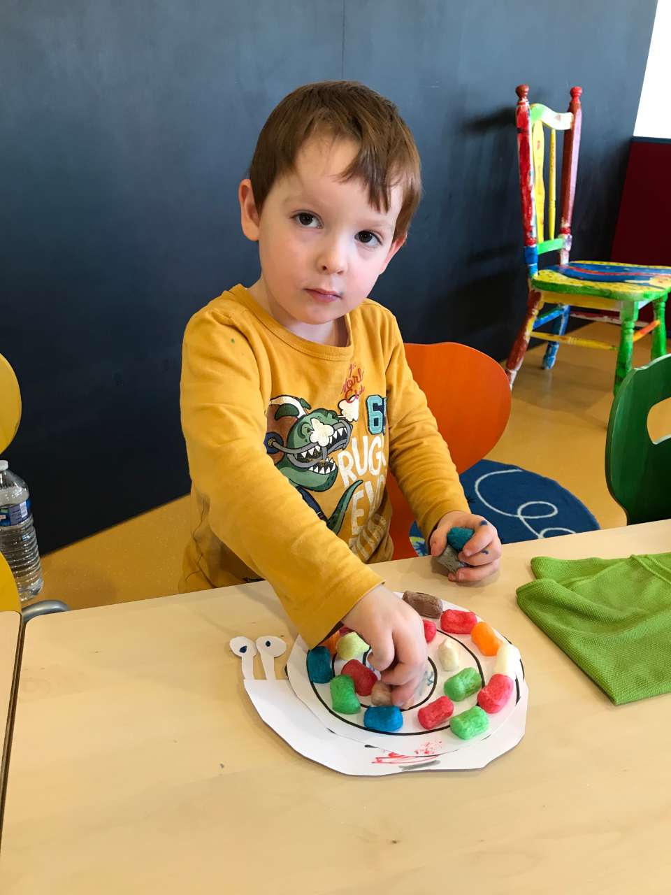 Beim rausschneiden sot ech den Kanner dat se déi eenzel Deeler beieneen leen sollen fir dat se se net verléieren. Dunn sot ech hinnen dat se dem Schléck säin Kierper däerfen faarweg molen sou wei se wëllen. Entweder mat Tusch Faarwen oder mat Bläistëftsfaarwen. Wei se domadder fäerdeg waren hunn ech hinnen gehollef alles zesummen ze pechen. Wei alles zesummen war hunn ech den Kanner eng naass Lomp ginn an den "Playmais" an hinnen erkläert dat se den "Playmais" virdrun ëmmer als eicht mussen op déi naass Lomp tuppen an en dann eréischt ob dem Schléck säin Haus drécken fir dat en hält.