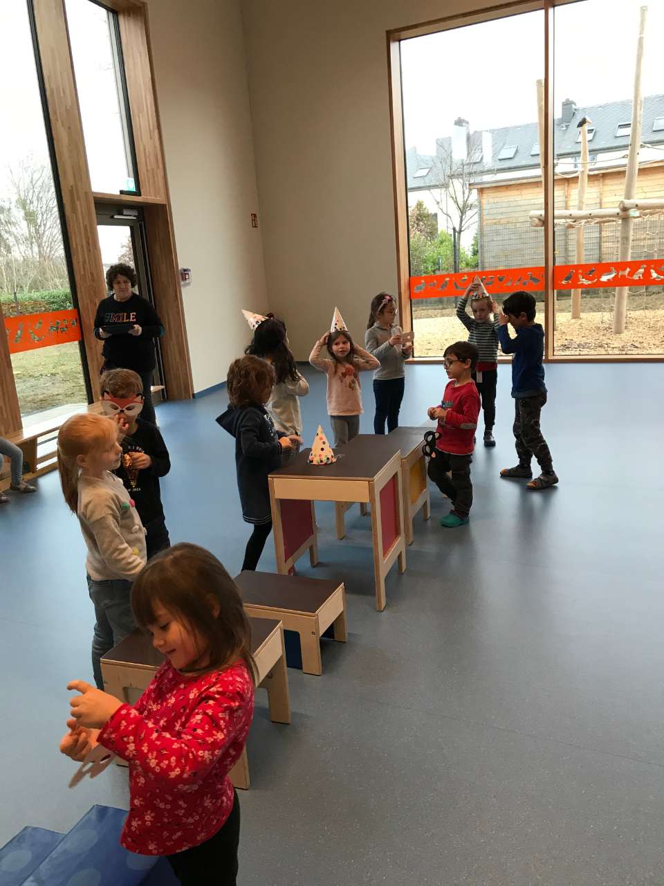 Fir dat eicht Spill hunn ech Kanner gefrot ob si mir hëllefen kéinten fir Spill ze preparéieren wou erop och direkt puer Kanner gehollef hunn. Dunn hunn ech hinnen erkläert dat et sou fonctionéieren géing wei bei "Eine Reise nach Jerusalem" just ouni Still mee dofir mat Hitt an Masken passend fir Fueszäit. Wann Musek aus gaangen ass hunn Kanner sech missen sou séier wei méiglech een Hutt oder eng Mask undoen an deen deen weder dat eent nach dat anert krut aus ausgescheet. Wan Musek erëm ugaange ass hunn Kanner hir Hitt an Masken rëm zeréck geluecht an ech hunn eppes ewech geholl.