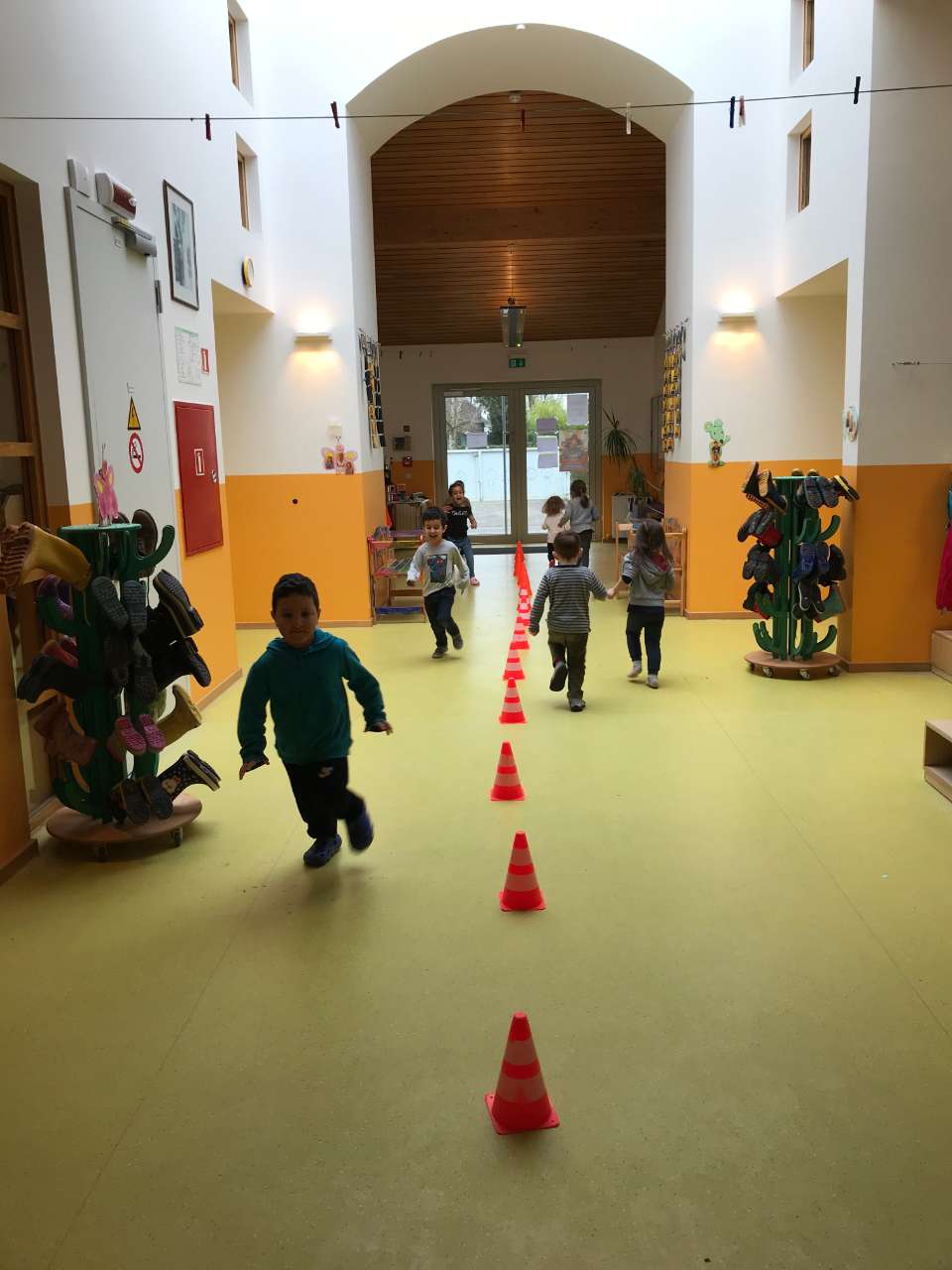 Wei Kanner all do waren, hunn ech hinnen gesot dat ma Spiller maachen wei Slalom lafen, hopsen an och lafen etc. Fir eis e bëssi waarm ze maachen hunn Kanner däerften déi eng Seid vun den Hittercher däerfen erof lafen an déi aner Seid erop. Wei se dat e puer mol gemaach haten, hunn se sech an enger Rei missen opstellen. Dunn hunn se missen Slalom ronderëm Hittercher lafen. Bei der éischter Ronn sot et den Kanner dat se erof lafen däerfen an ënnen mussen stoen bleiwen. Ab da zweeter Ronn hunn ech all Kand eenzel geruff well déi eng méi séier waren wei déi aner. Wei mir mam Slalom lafen fäerdeg waren, hunn ech den Kanner erkläert dat ma lo déi selwecht streck erof hopsen an zwar tëscht den Hittercher. Eemol sprangen ass den Hittchen tëscht den Féiss nach eng kéier sprangen steet een tëscht zwee Hittercher.