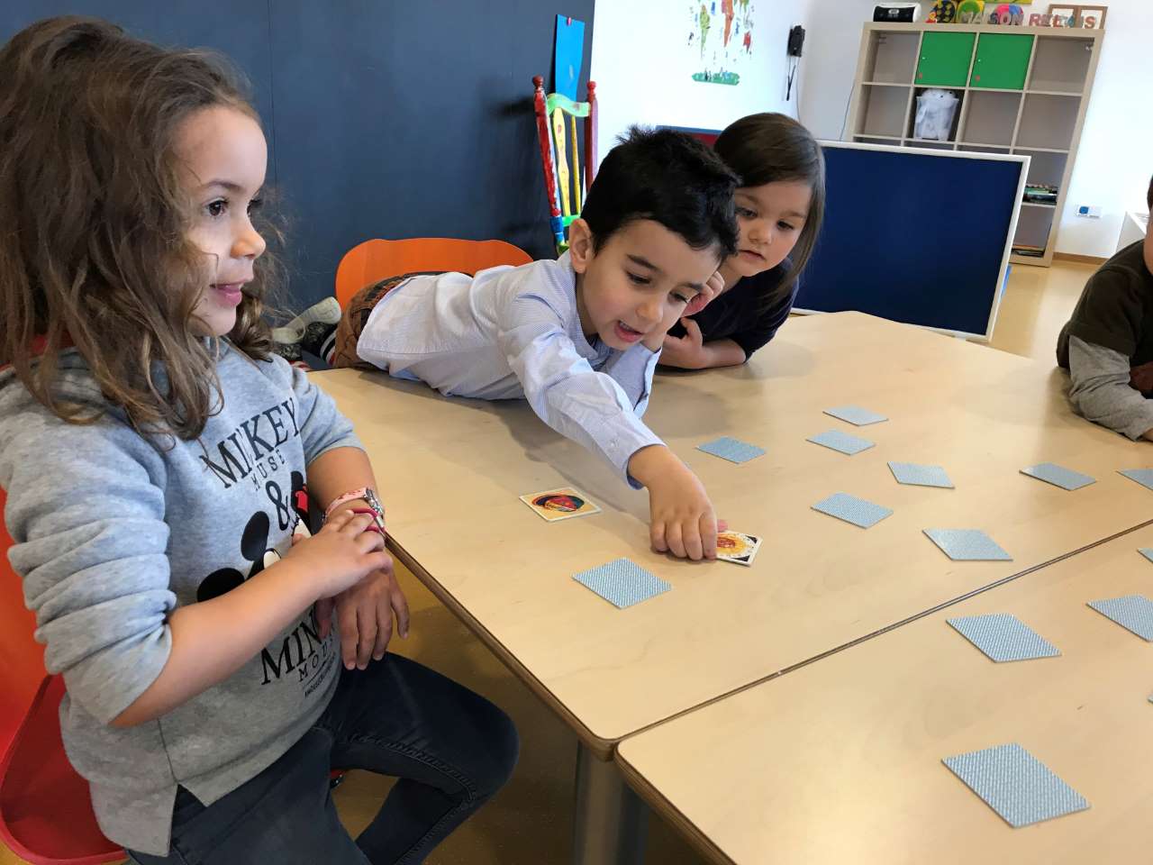 Als éischt hunn mer ugefaangen Memory no den bekannten Reegelen ze spillen. Dat heescht d'Kanner mussen der Rei no 2 der selwechter Kaarten fannen. Nodeems se des dann fonnt hunn, hunn mer zesummen probéiert ze beschreiwen wat mer op deenen Kaarten gesinn hunn, dëst ob Lëtzebuergesch an op Franséisch.
