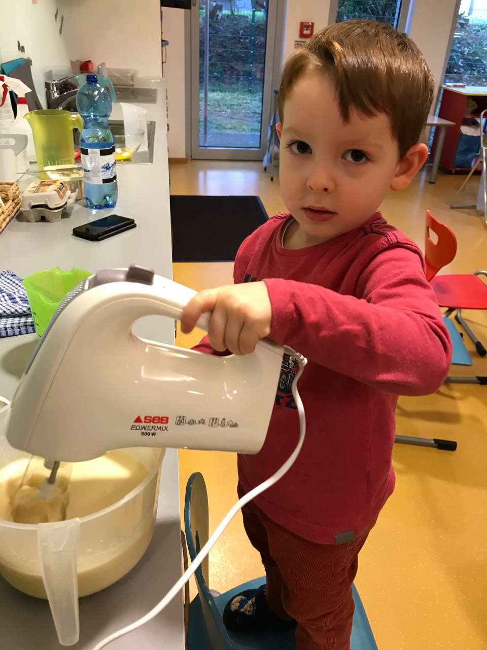 Dono hunn awer dunn ganz vill Kanner festgestallt dass se des schonn vun Doheem kennen. Doropshin gouf dunn Etappe vir Etappe mat den Kanner zesummen duerchgeholl - Eeër opmaachen an mam Miel, Mëllech, Botter an Waasser verréieren.