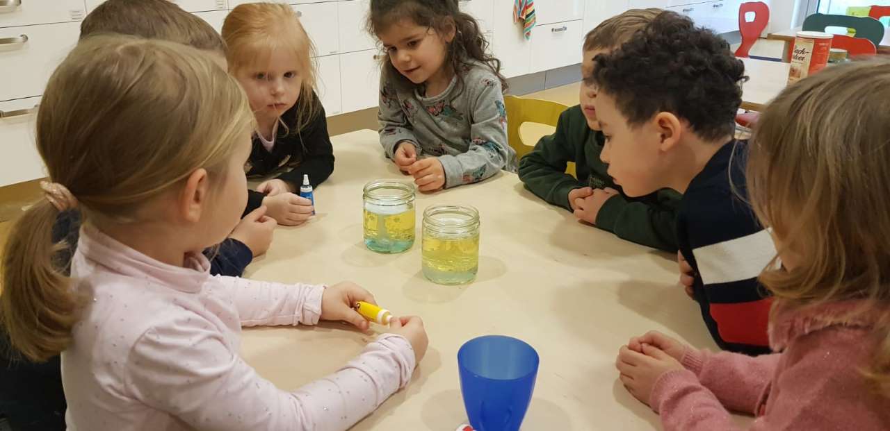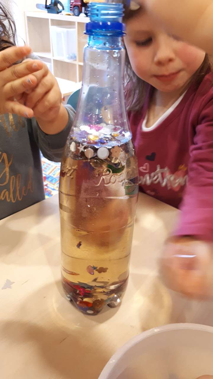 | Ziele (siehe z.B. Rahmenplan) | Développement des sens de l'enfant Motricité Manipulation des petits objets Respect de l'autre (attendre son tour) Expérimentation et compréhension qu'un liquide plus épais comme la glycérine, fait bouger les objets beaucoup moins vite que de l'eau |