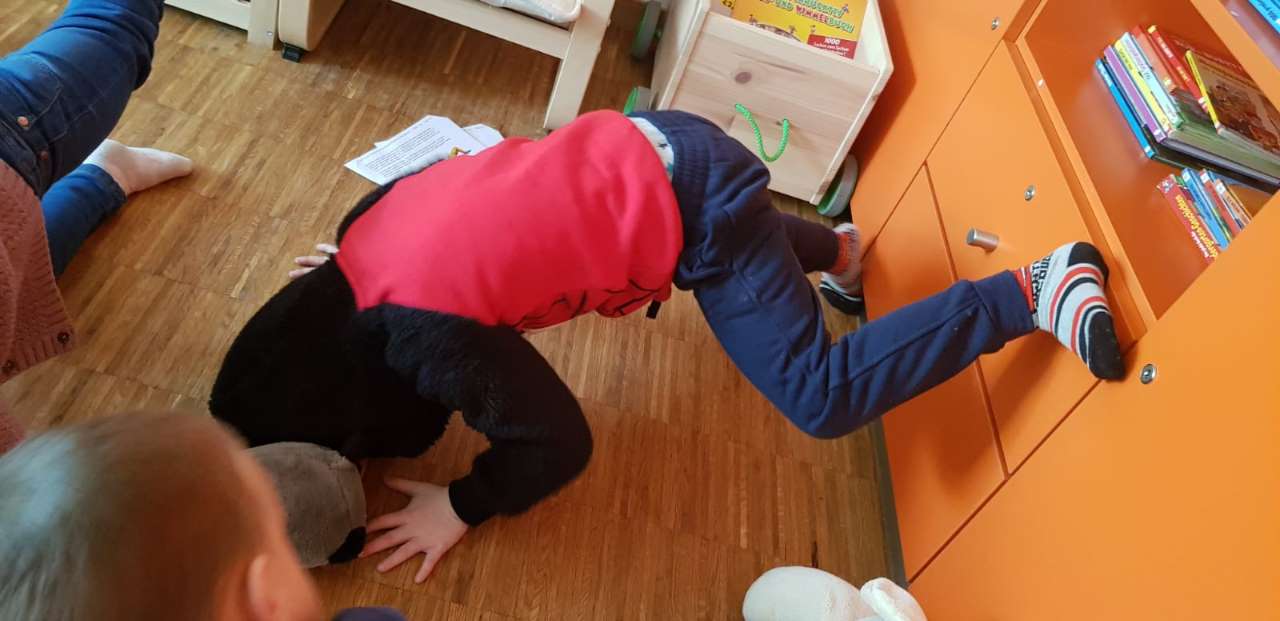 Au début de la séance j'ai proposé quelques exercises d'échauffement qui étaient liés au niveau de développment des enfants (souffler fort comme le vent, dire oui et non avec la tête, se dire bonjour avec les pieds, etc)